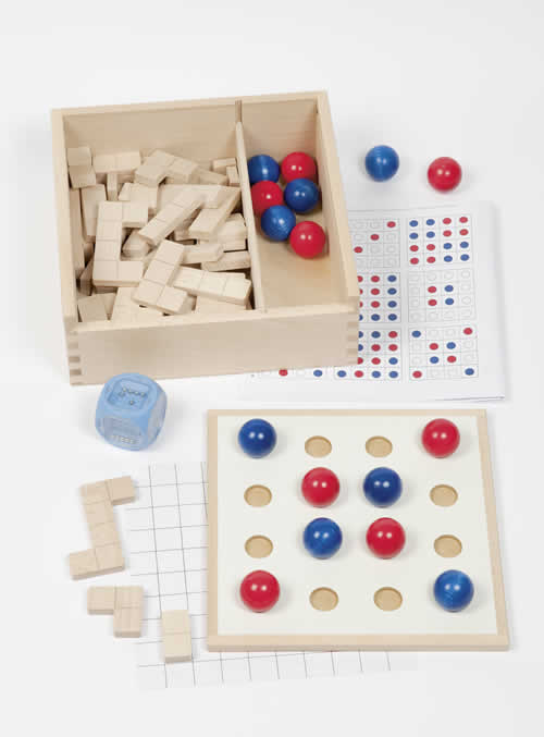 Spielidee: Dietmar Wenzel.Spielweise/Förderung: Ganz schön verflixt, herauszufinden, welche Augenzahl denn eigentlich mit dem Wilden Würfel gewürfelt wurde. Mit Hilfe von Kugeln und einem speziellen Legebrett erarbeitet man sich spielerisch die Mengenerfassung.In einer weiteren Spielvariante wird mit der gewürfelten Zahl bestimmt, welches Holzteil in den Rahmen eingelegt wird. Nach und nach füllt sich das Brett. Jetzt muss man verflixt aufpassen, dass alle Teile richtig dazugelegt werden und das Brett am Ende ohne Lücken zugelegt ist. Dies fördert die visuelle Wahrnehmung, insbesondere die Erfassung der Raumlage, die Erfassung von Teilmengen, Entwicklung von Mengenbegriffen, Konzentration und Ausdauer. Hierbei wird ganz spielerisch die mathematische Vorläuferkompetenz entwickelt. Das Spiel beinhaltet eine ausführliche Spielanleitung mit vielen Spielvorschlägen und zusätzlichen Arbeits- und Kopiervorlagen und lässt sich im Einzelspiel oder in der Kleingruppe gut einsetzen. Ab 3 Jahre.Inhalt/Material: Wilder Würfel aus Kunststoff, 16 Holzkugeln (8 rote, 8 blaue), 52 Legeteile aus Holz, Holzkasten mit Schiebedeckel (beidseitiges Spielfeld: Oberseite als Legebrett, Unterseite Spielfeld mit 16 Vertiefungen), Raster-Folie, ausführliche Spielanleitung mit Vorlagenseiten und Kopiervorlagen. Größe: Kugel Ø 3 cm, Kiste 23 x 23 x 8,5 cm.