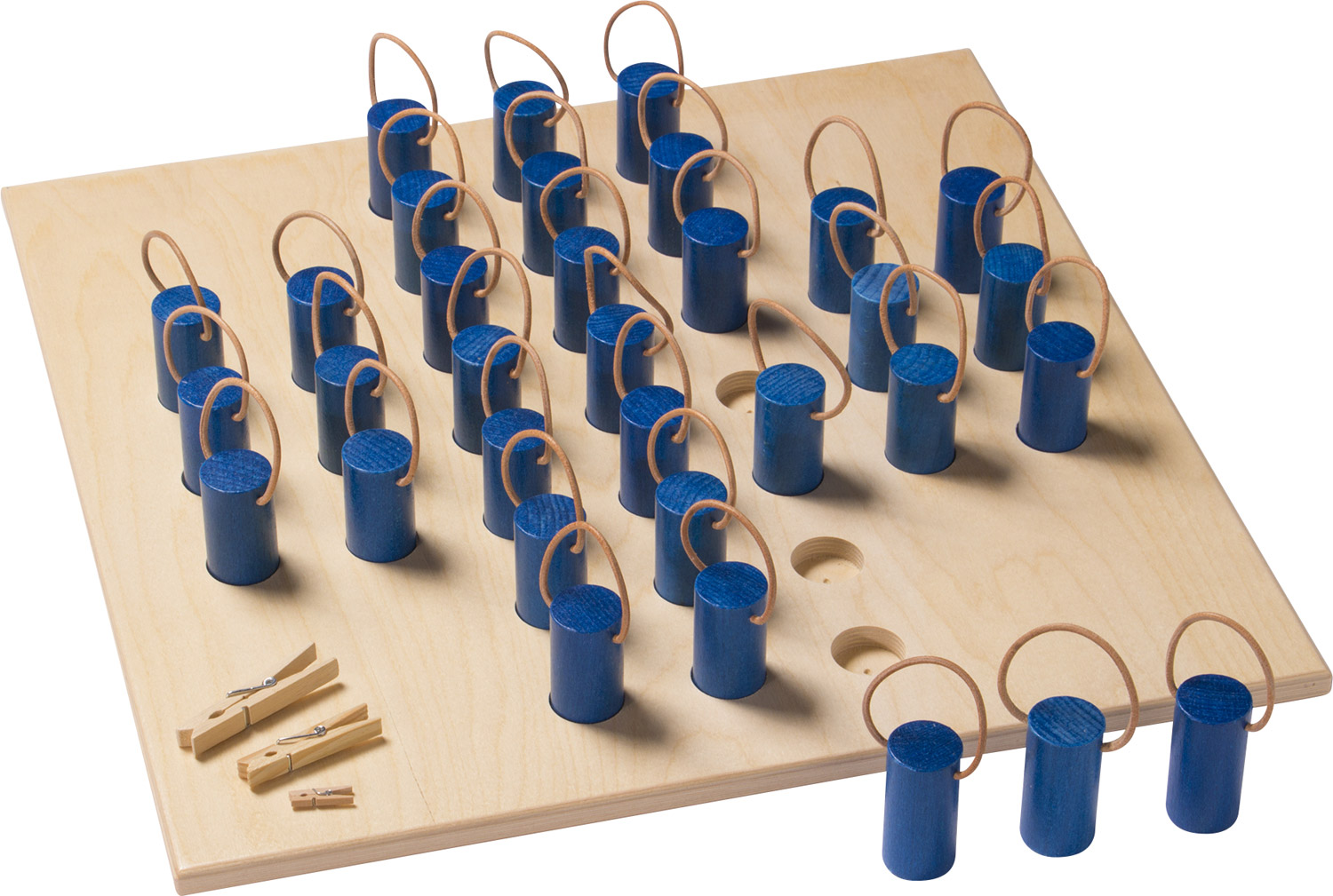 Diese Solitär-Variation bietet die verschiedensten Trainingsmöglichkeiten: Streckung der Finger, Beugung der Finger, Pinzettengriff oder Kraftdosierung mit Hilfe der Wäscheklammern. Fingerkoordination, Fingergeschicklichkeit, Greiffunktion, logisches Denken und räumliches Vorstellungsvermögen werden auf spielerische Art und Weise gefördert.