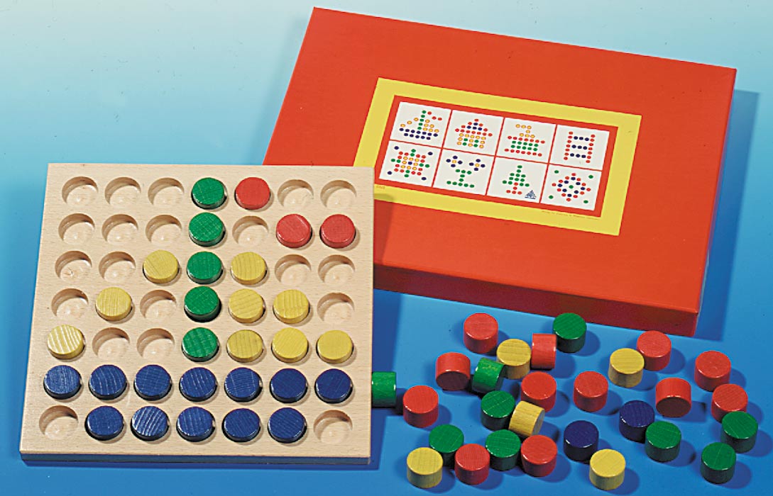 17 x 17 cm, mit 49 Löchern Ø 18 mm. 63 Hartholzwalzenstecker Ø 18 cm, 12 mm lang, in den Farben: rot, gelb, grün, blau. Im bedruckten Karton 24 x 18 x 4 cm.