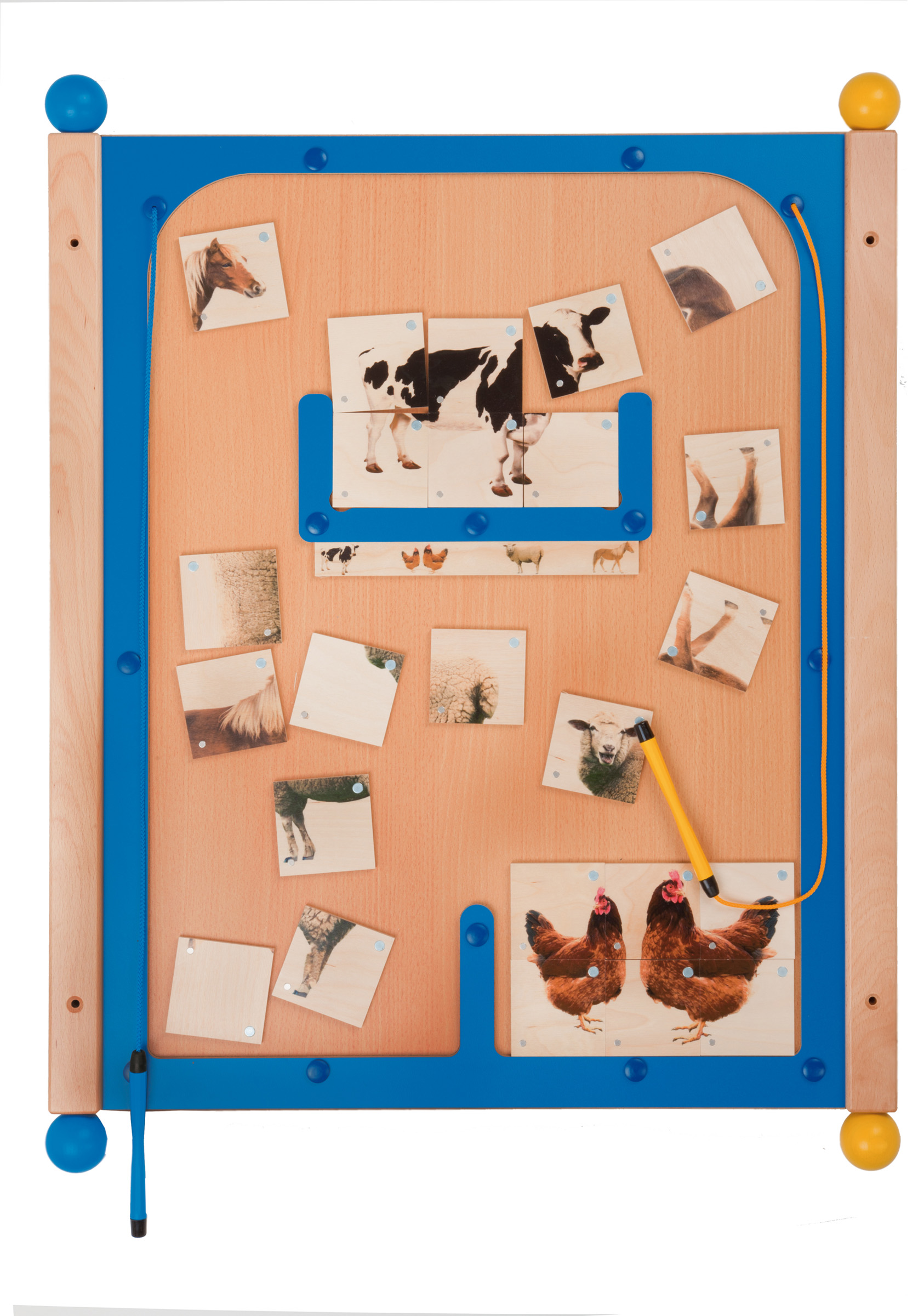 • Die passenden Elemente werden ausgesucht und mit den Magnetstiften nach oben in den Bildrahmen geführt und dort so zusammengelegt, dass ein vollständiges Tierbild entsteht.