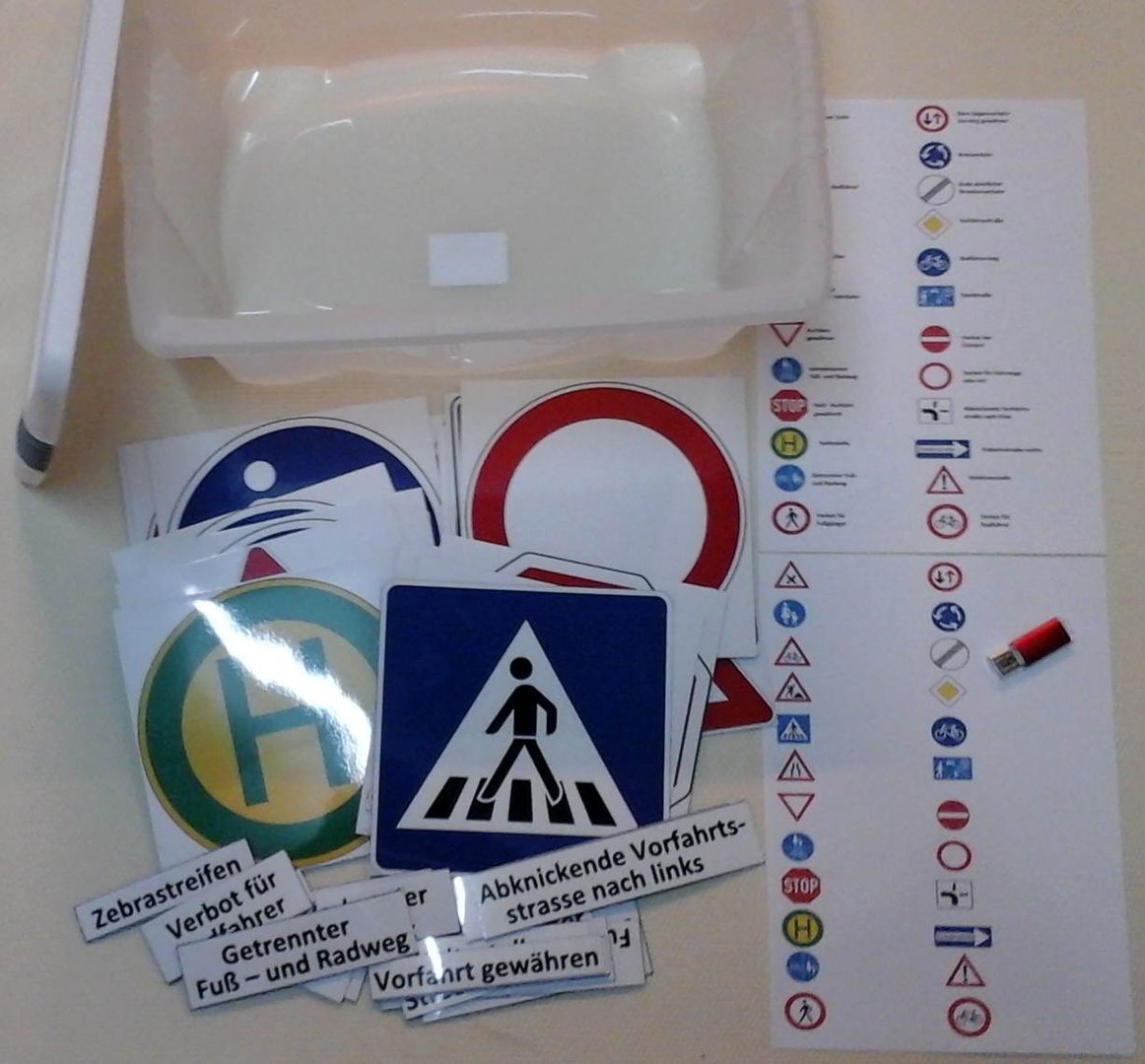 Verschiedene Verkehrschilder einfach und anschaulich dargestellt. Mit Hilfe der Namensschilder können die Kinder den Schildern ihre Namen zuordnen. Superleicht verständlich begreifen die Kinder dann welches Schild was bedeutet und worauf sie achten müssen. Es lassen sich damit auch prima Rollenspiele verantstalten, sodas die Kinder die Funktion der Schilder spielerisch verinnerlichen können. Für mehr Sicherheit im Straßenverkehr.