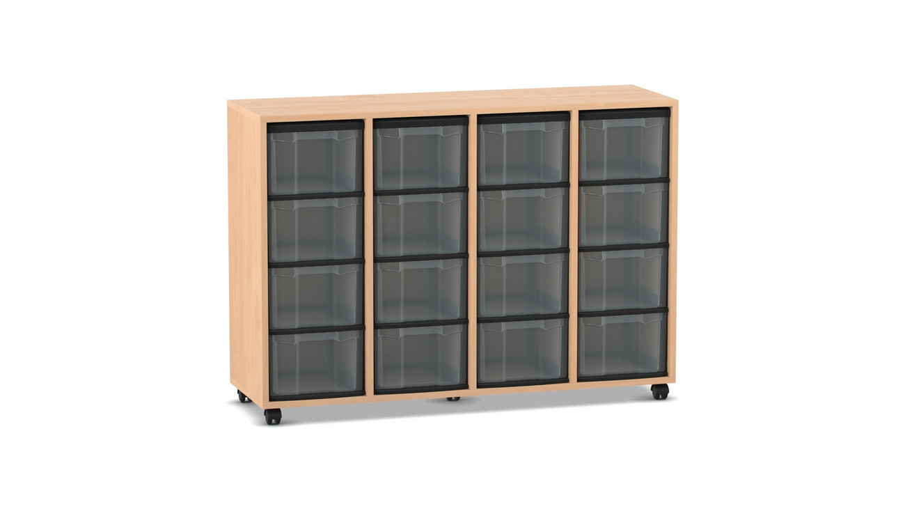 Flexeo Regal, Buche hell, 4 Reihen, 16 transparente große Boxen, B 130,7 x H 92,3 x T 40,8 cm, Sockel