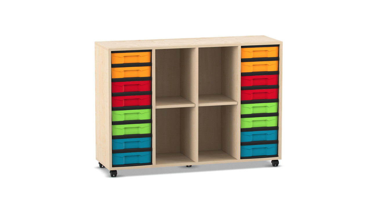 In den Fächern unserer Fachregale ist alles sauber aufgeräumt. Buntstifte, Scheren, Malkästen, Blöcke, Klebestifte, aber auch Hefte und Bücher, alles passt ins Fach. Und sollten einmal Farben auslaufen, so können Sie die hygienischen Kunststoffschubladen mühelos auswaschen.