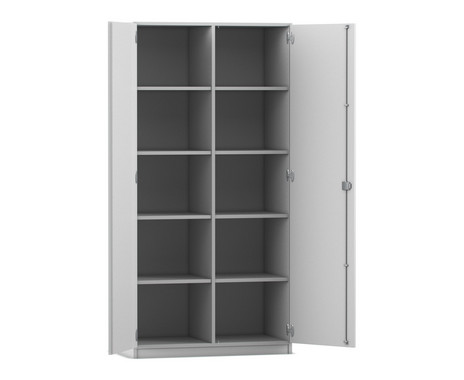 Mit den großzügigen 5 Ebenen (4 Einlegeböden) findet alles seinen Platz und ist sicher und ordentlich verstaut. Der Schrank ist mit Drehtüren und 4 Einlegeböden ausgestattet. Besonders geeignet z.B. als Schrank für Bücher oder Papier. Die Mittelwand verkürzt die Spannweite der Böden und wirkt so einer Durchbiegung entgegen.