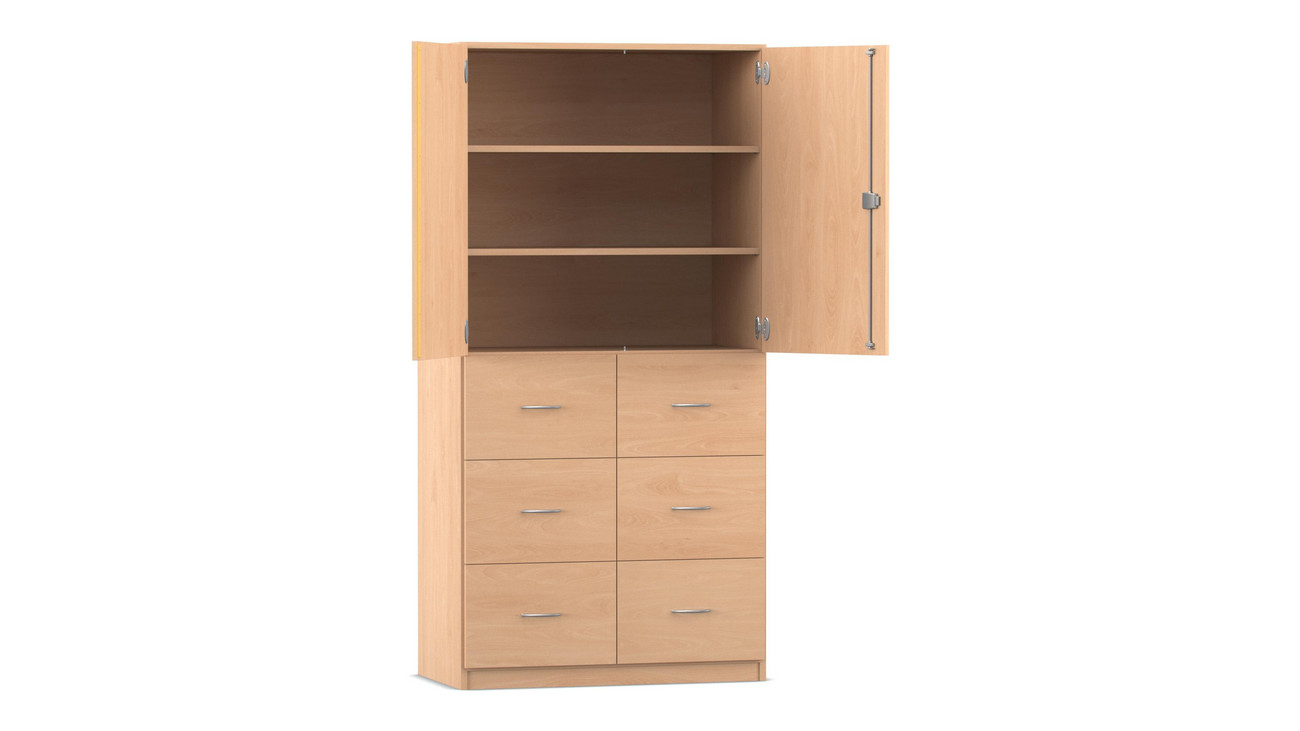 Schubladen-Schrankkombination, ohne Mittelwand, 6 große Holzschubladen mit Bogengriffen, mit Halbtüren, 2 Fachböden (individuell einstellbar)