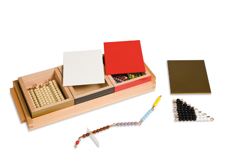 Das Material besteht aus einem Tablett mit drei Kästen: • eines mit farbigen Perlenstäbchen (fünf Perlentreppen), • das zweite mit schwarz-weißen Stäbchen (eine Treppe) das dritte mit 23 goldenen Zehnerstäbchen