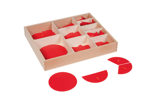 1 Holzkasten mit 10 Fächern, worin sich fünf Sätze Bruchrechenkreise von 1 bis 10/10 aus Kunststoff befinden