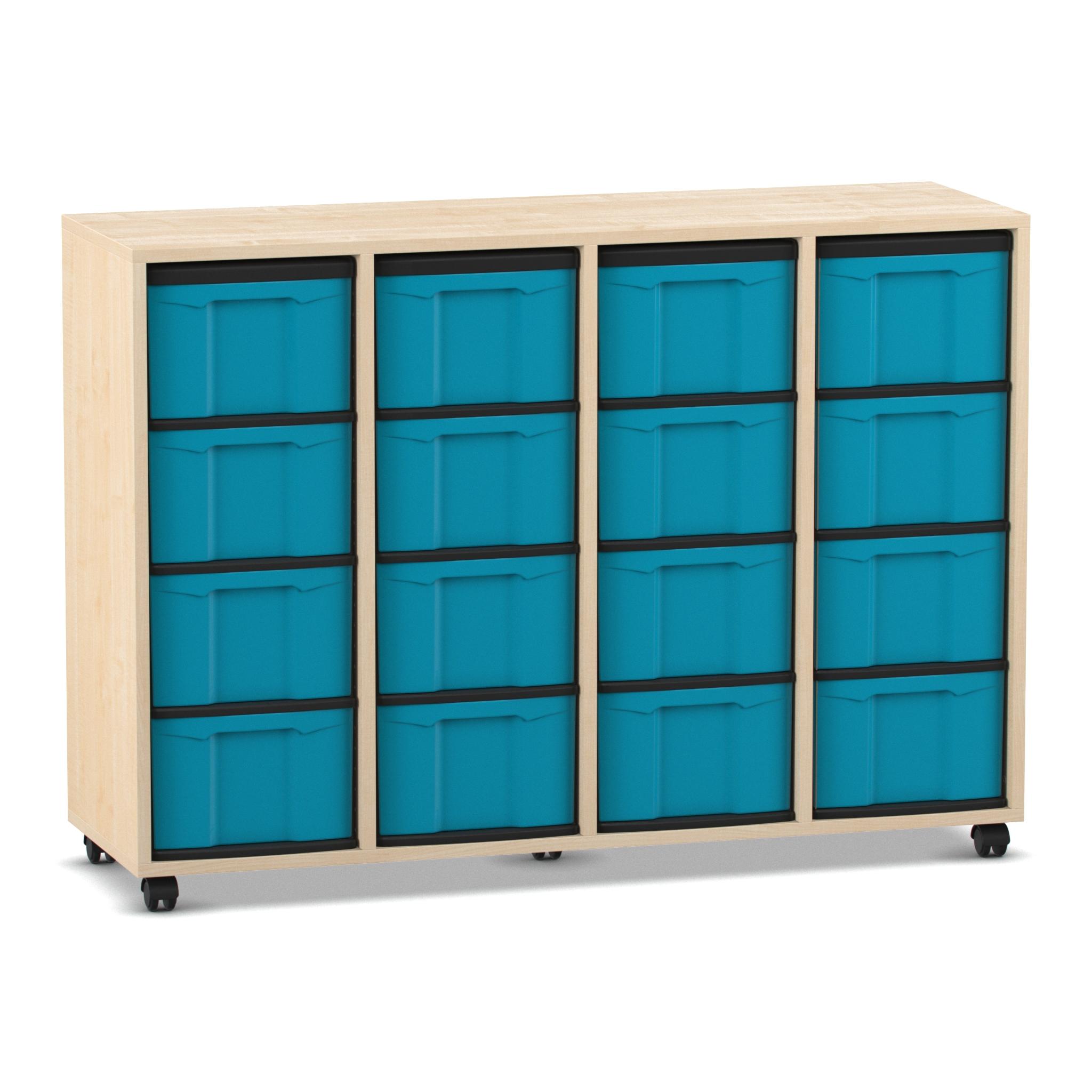 Flexeo Regal mit 4 Reihen, Dekor Ahorn Honig, Rollen, 16 hohe Schubladen blau