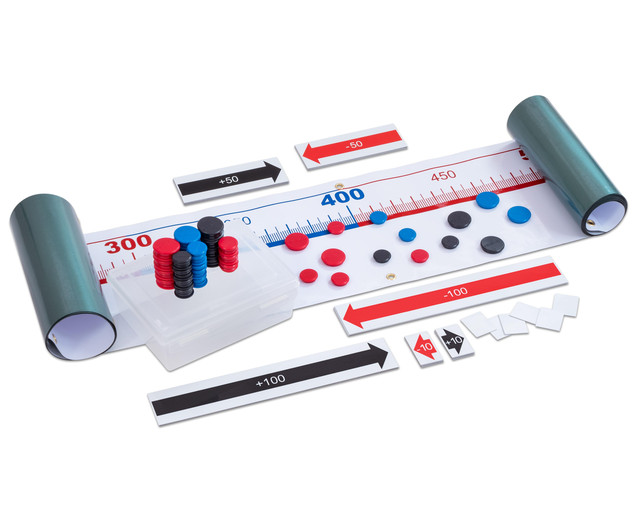 Mit großen magnetischen Pfeilen machen Sie Rechenwege sichtbar. Die Magnetstreifen lassen sich wenden. Auf einer Seite befinden sich schwarze Plus-, auf der anderen rote Minuspfeile. Die Pluspfeile zeigen zum 1000er, die Minuspfeile zur 0. Mit farbigen Magneten und Symbolplättchen zeigen Sie die Positionen der Zahlen an. Sie können das Zahlenband mit Whiteboard-Stiften beschreiben. Das Band ist abriebfest bedruckt. Ösen ermöglichen eine problemlose Montage.