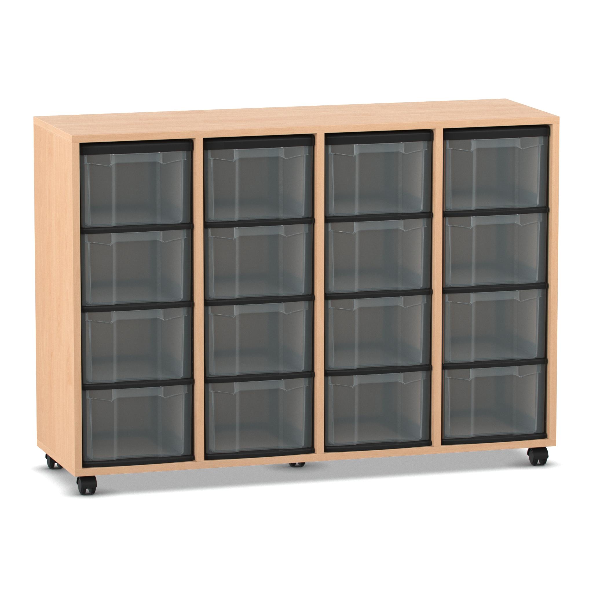 Flexeo Regal mit 4 Reihen, Dekor Buche hell, Stellfüße, 16 hohe Schubladen transparent