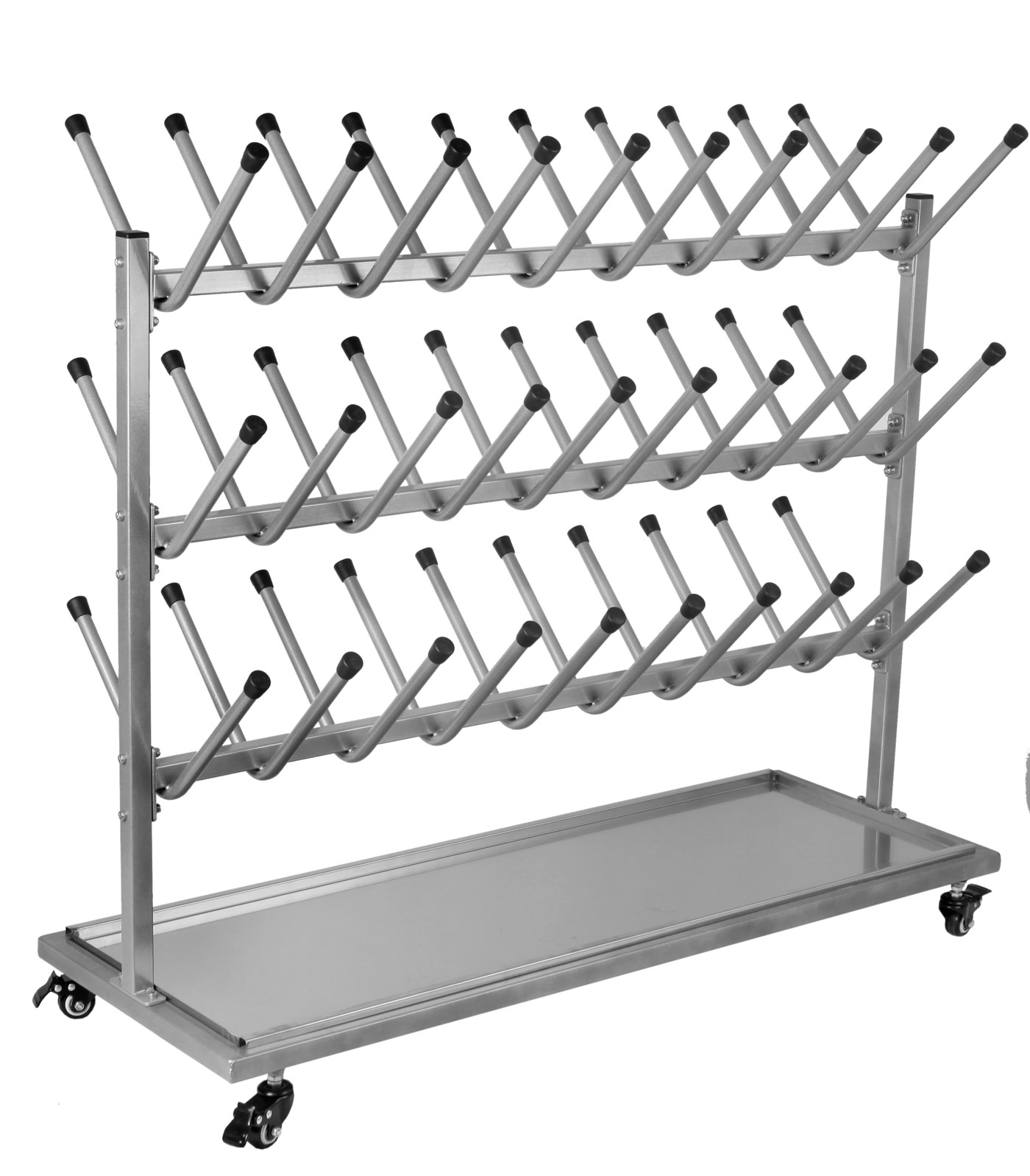 Auf dem Stiefelwagen haben bis zu 30 Stiefel- oder Schuhpaare Platz. Die Metallwanne ermöglicht das Auffangen von Schmutz und Wasser.