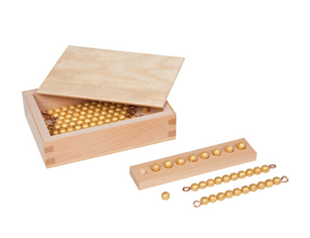Kasten mit neun goldenen Zehnerstäbchen und zehn goldenen Einerperlen, lose Perlen Kunststoff