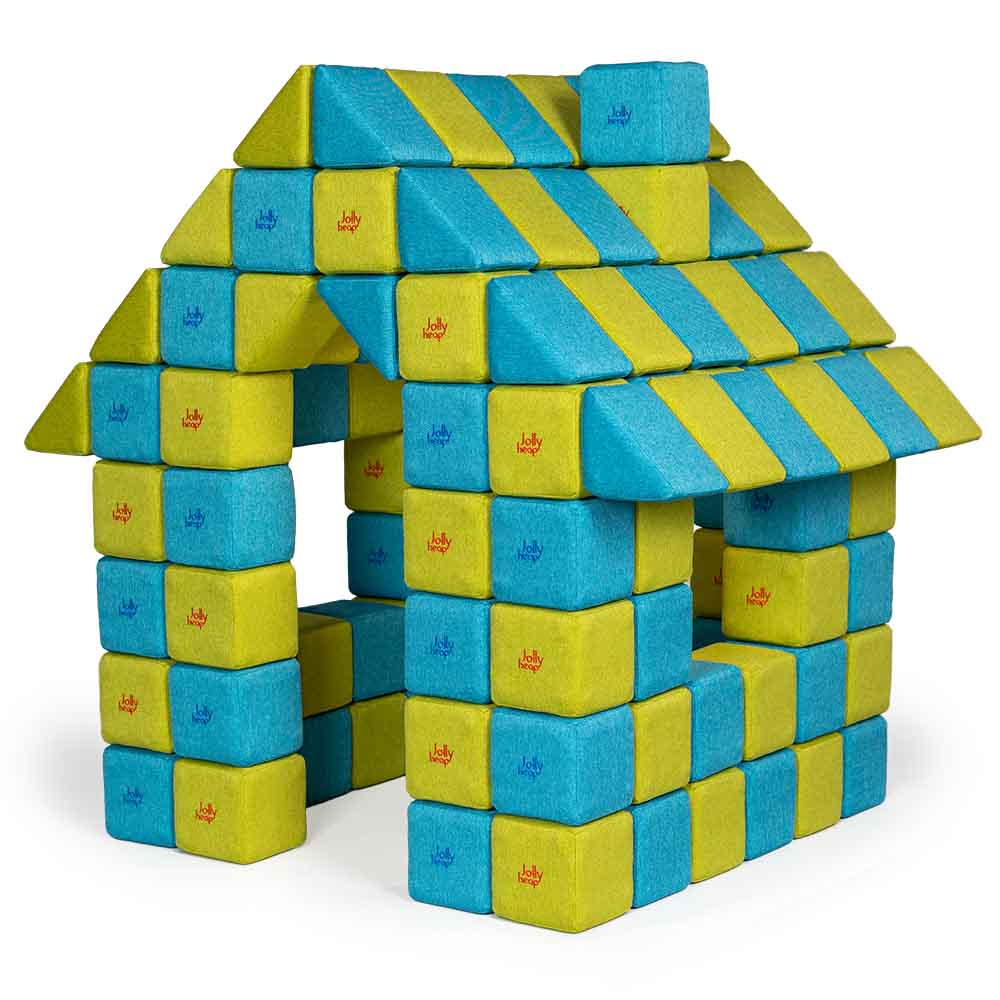 Das Jolly Heap Set JOY enthält 150 magnetische Bausteine, davon 100 Würfel und 50 Dreiecke. Mit diesem größten Bausteine-Set lassen sich große Bauprojekte realisieren, sogar ein Haus mit Dach!