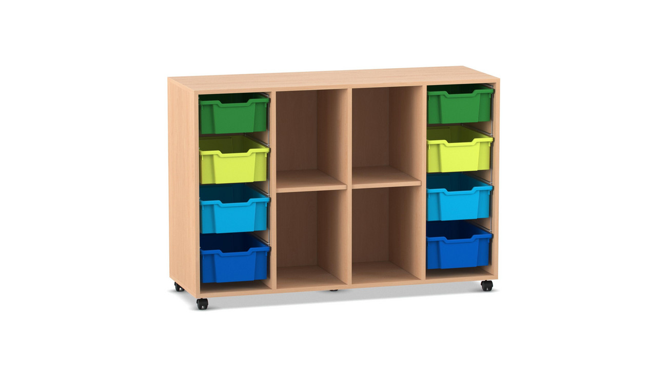 Flexeo Regal PRO, 4 Reihen, 8 Boxen, H 99,1 cm, B 143,9 cm, T 48 cm , Boxen bunt B