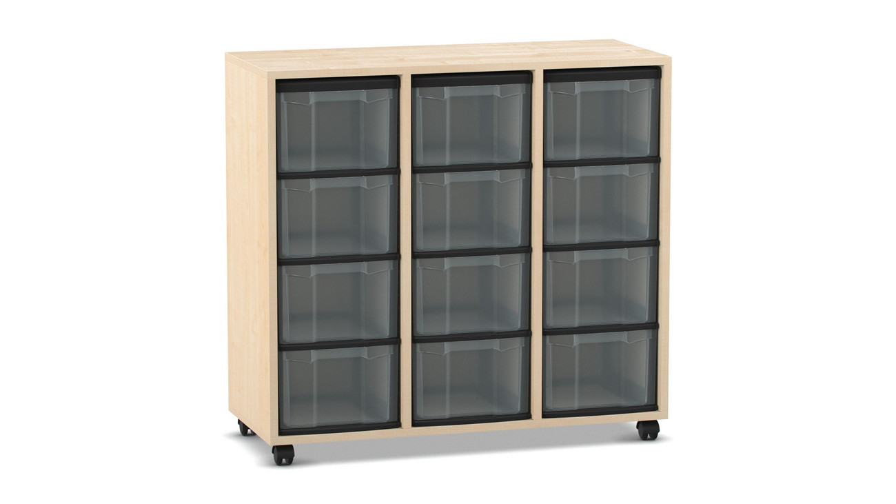 Flexeo® Regal Ahorn honig, HxBxT: 92,3 x 98,6 x 40,8 cm, 3 Reihen, 12 große Boxen transparent, Rollen