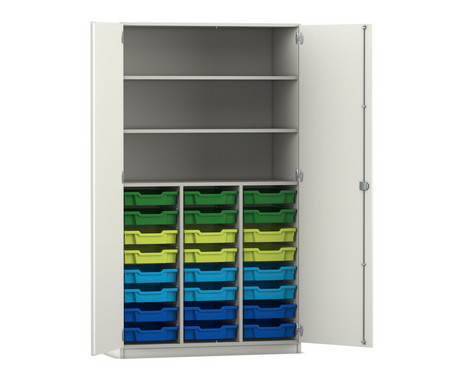 Flexeo Hochschrank PRO, weiß, 24 kleine Boxen, 3 Fächer, HxBxT 190 x 108 x 50 cm, bunt B, Bogengriff mit Schloss