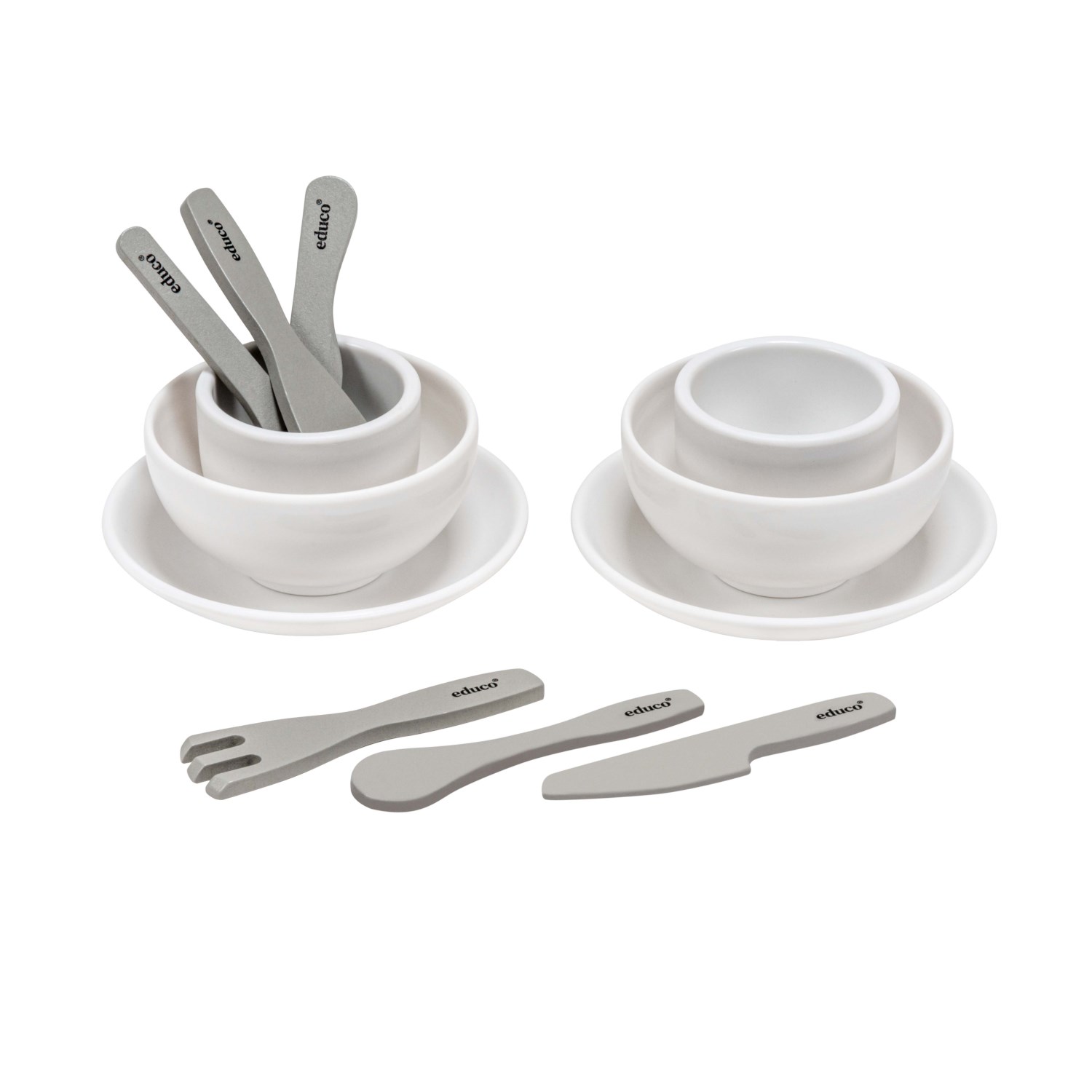 Geschirrset aus Holz mit insgesamt 10 Teilen, Besteck, Tassen und Schüsseln.