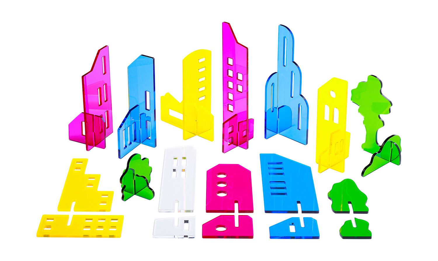 Das Phänomen Licht und Schatten fasziniert Kinder und fordert zum Experimentieren auf. Beim Beleuchten entstehen farbige Schatten einer Stadt, die sich effektvoll untereinander mischen. Kleine Häuser werden in der Projektion an der Wand zu einer beeindruckend großen, leuchtenden Skyline. Die unterschiedlich gestalteten Ober- und Unterteile lassen sich miteinander kombinieren und fantasievoll zusammensetzen.