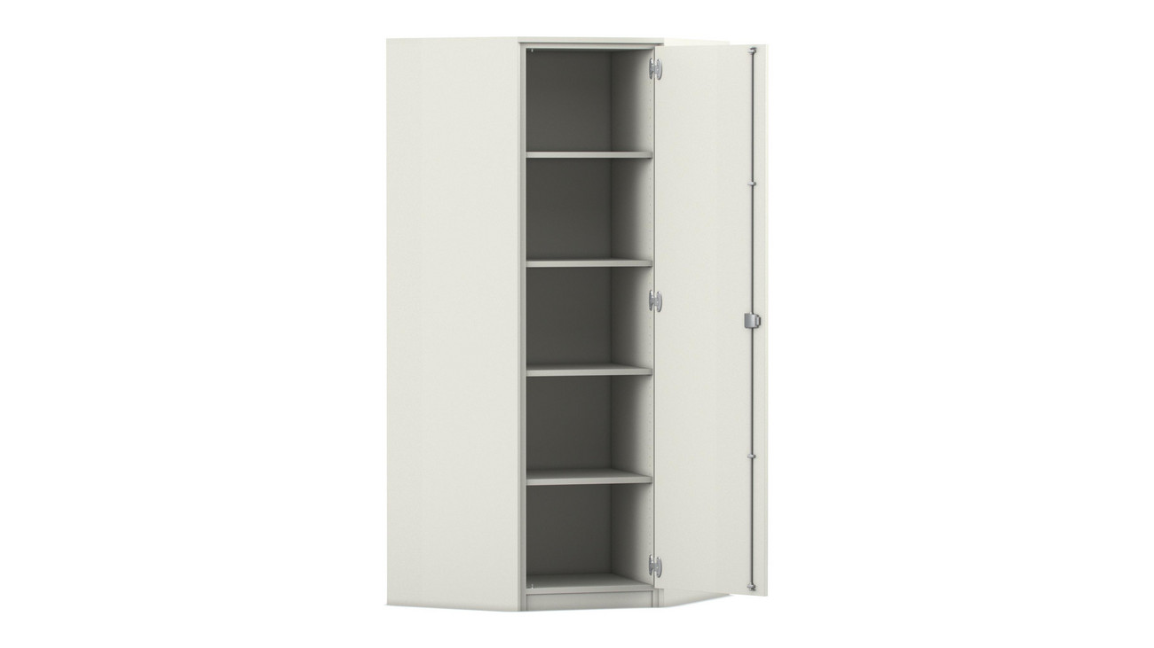 Flexeo Eckschrank, weiß, 4 Fachböden, HxT 190 x 50 cm, Bogengriff mit Schloss