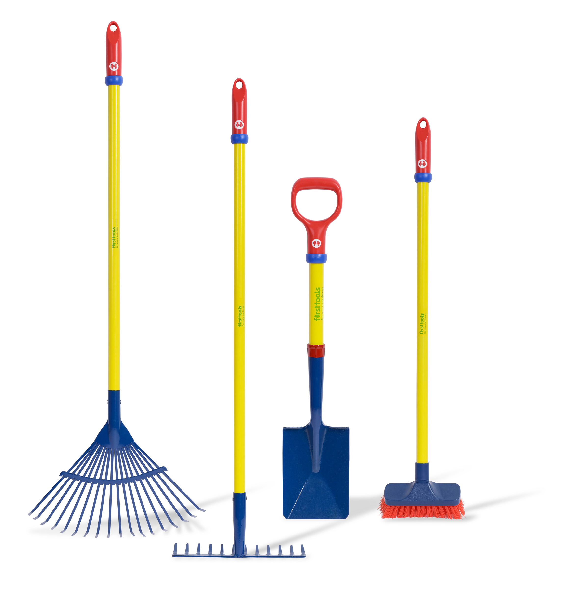 Hier ist die Grundausstattung für jeden Kindergarten-Garten oder Schulgarten. Laubrechen, Harke, Besen und Spaten helfen kleinen Gärtnern bei der Gartenarbeit.