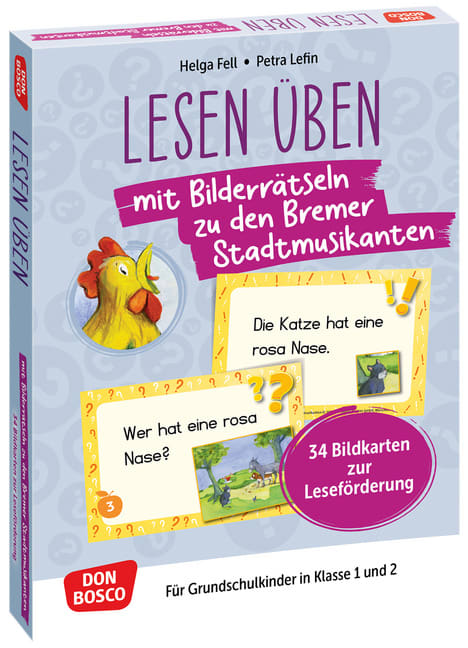 Lesen üben mit Bilderrätseln zu den Bremer Stadtmusikanten, 34 Karten, DIN A5, beidseitig bedruckt, auf festem 350g-Karton, inkl. 8-seitigem methodischen Begleitheft, in farbiger Pappbox, plastikfrei verpackt mit OVP-Siegel