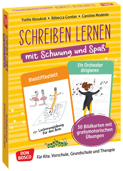 Schreiben lernen mit Schwung und Spaß: DIN A5, 30 Karten, beidseitig bedruckt, auf festem 350g-Karton, farbig illustriert, inkl. Booklet mit method. Hinweisen und Bonusdownload, in farbiger Pappbox, plastikfrei verpackt mit OVP-Siegel