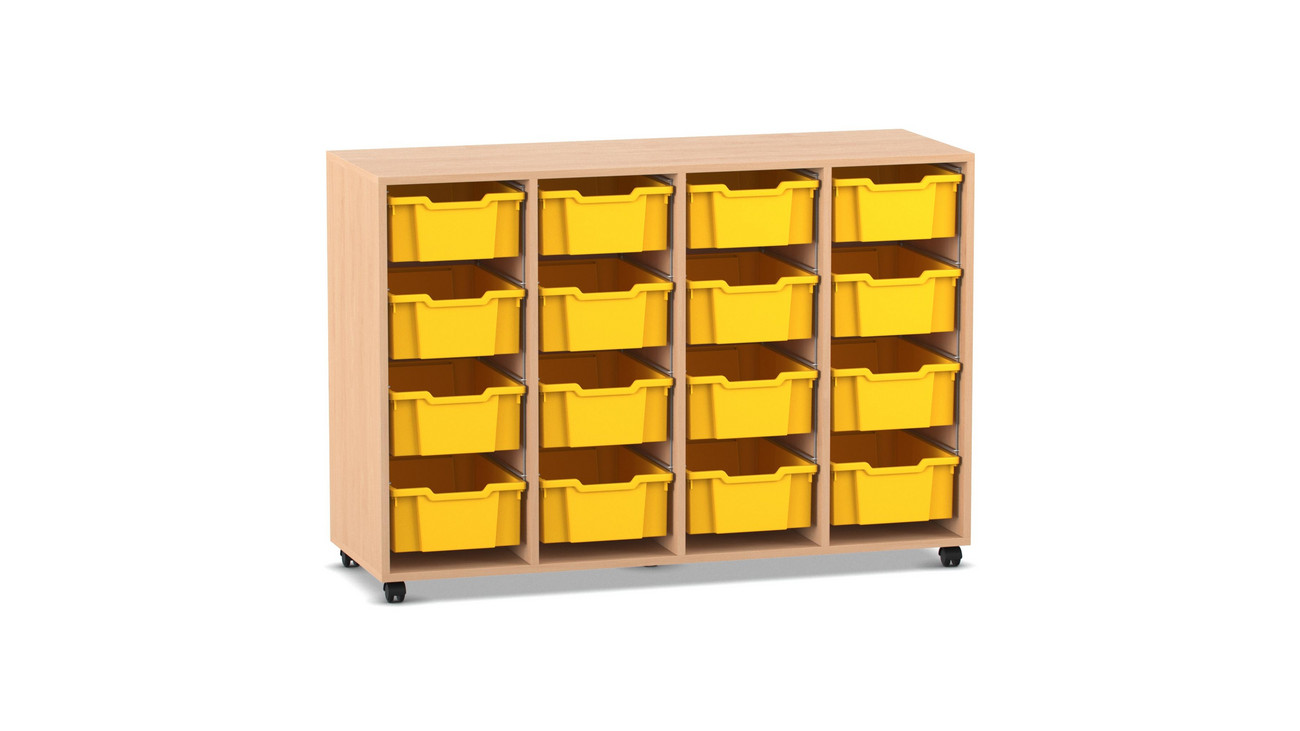 Flexeo Regal PRO, Buche hell, 4 Reihen, 16 große Boxen gelb, Sockel, 143,9x99,1x48 cm