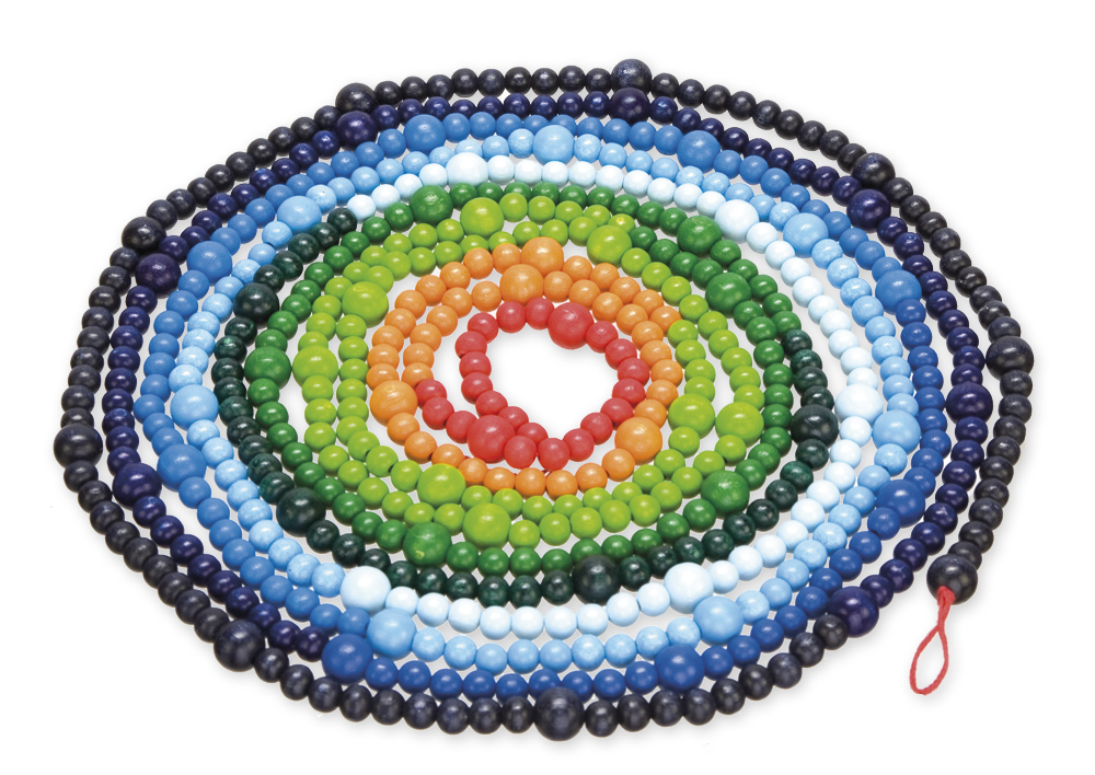 Die Erdzeitalter-Kette aus Holz zeigt anschaulich das Alter der Erde. Jede Perle steht für 1 Million Jahre. Unterschiedliche Farben markieren die verschiedenen Erdzeitalter. Der kleine rote Teil der Kette symbolisiert die Menschheit. Modelle von Tieren und Pflanzen aus den verschiedensten Epochen können zugeordnet und entlang der Kette platziert werden.