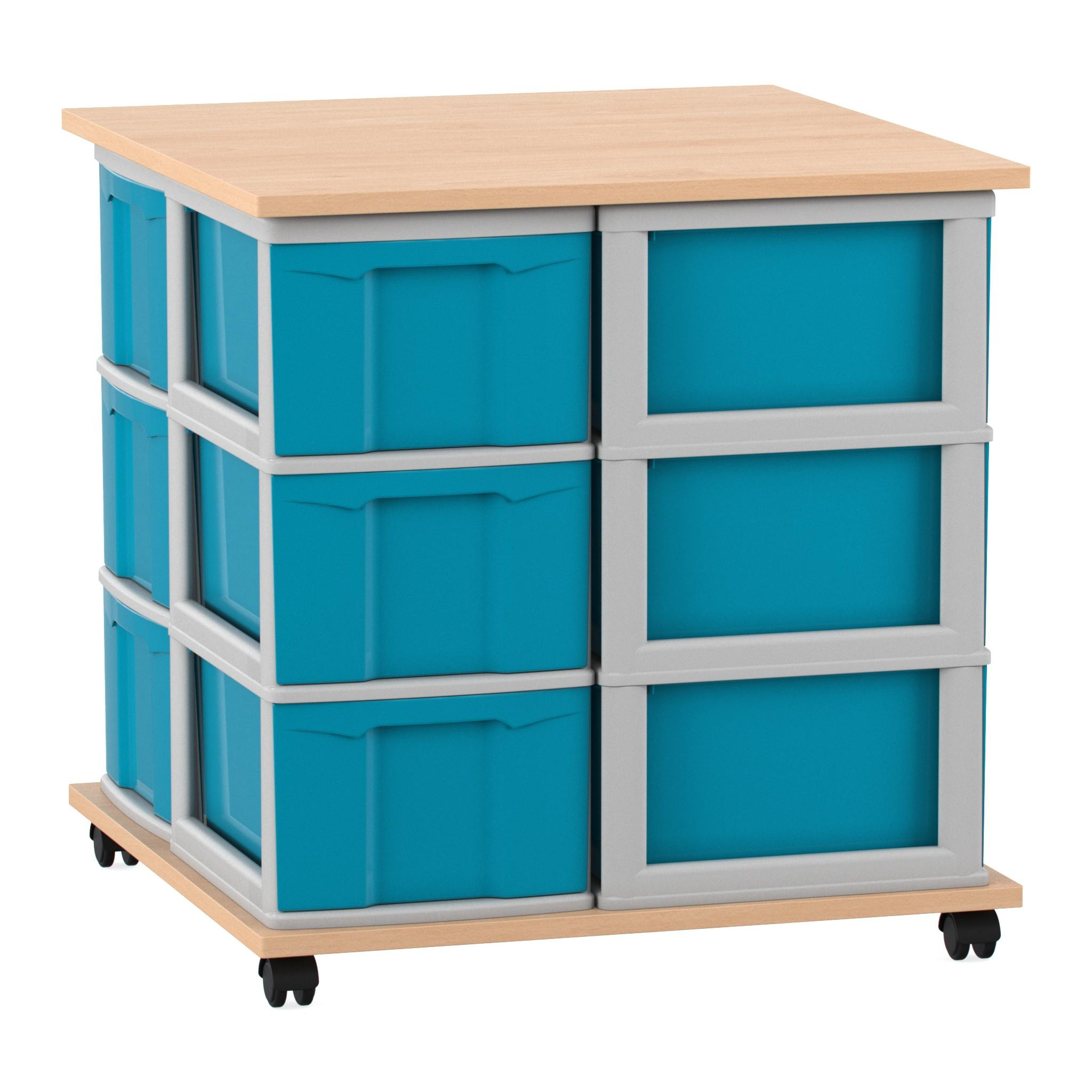 Flexeo® Fahrbares Containersystem Buche hell mit Ablage, 12 große Boxen blau Rahmen grau