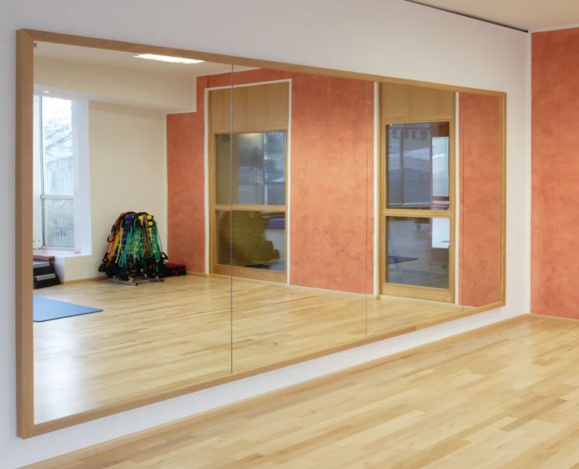 Der Sicherheitsspiegel „Kristall“ ist speziell für Sportstätten entwickelt. Die Spiegelpaneelen bestehen aus einem 6 mm starken Kristallglasspiegel, aufkaschiert auf einer extrem leichten Kunststoffplatte mit PVC-Rücken. Die 27 mm starken Verbundpaneelen dienen der Sicherheit und machen den Sicherheitsspiegel „Kristall“ stoß- und bruchfest. Durch die stabilen Montageleisten werden Unebenheiten der Wände einfach ausgeglichen. Gleichzeitig sorgen sie im Zusammenspiel mit den Verbundpaneelen für ein verzerrungsfreies Spiegelbild.