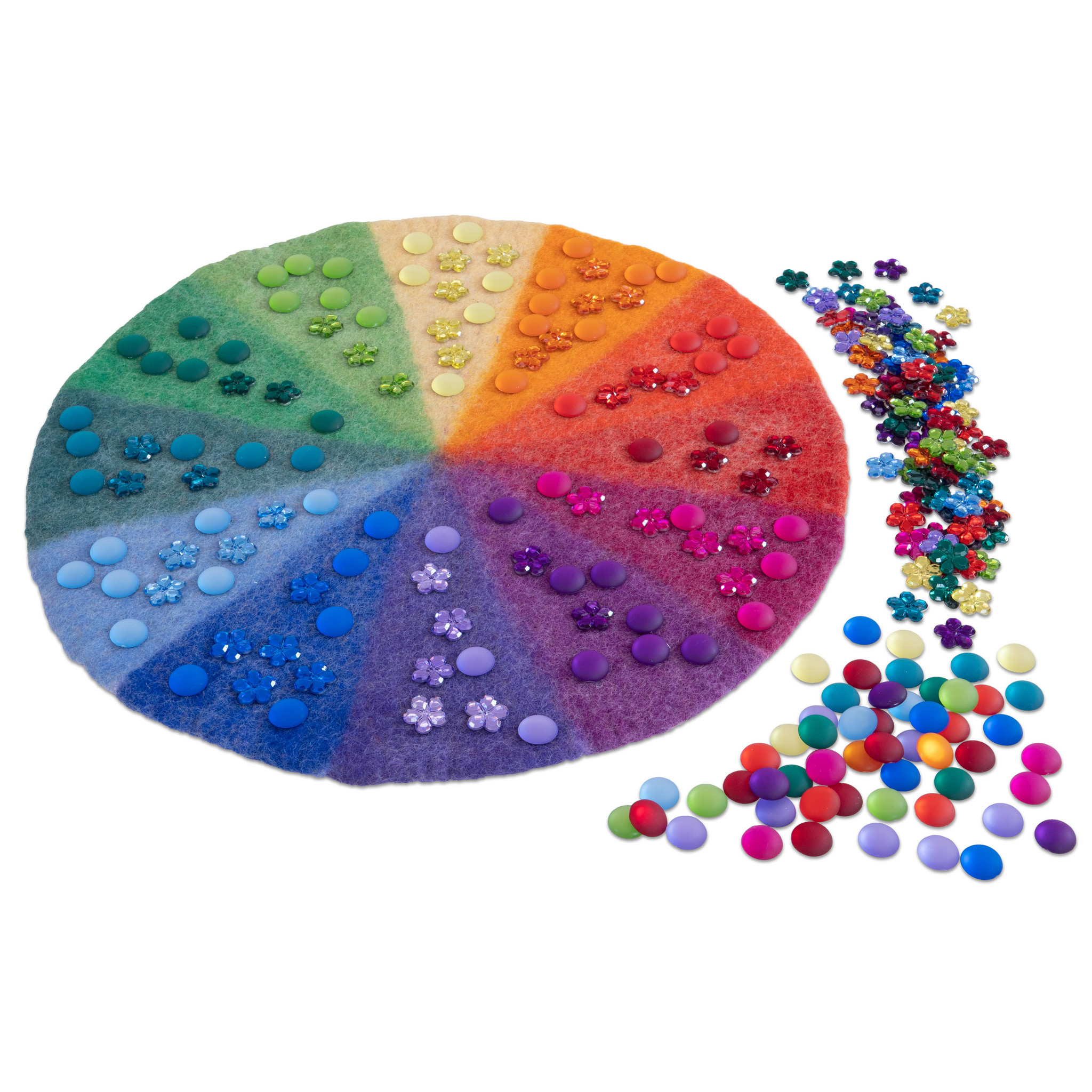 Farbenfrohe Filzmatte mit 240 Schmucksteinen – ideal für Farblehre & Jahreskreis