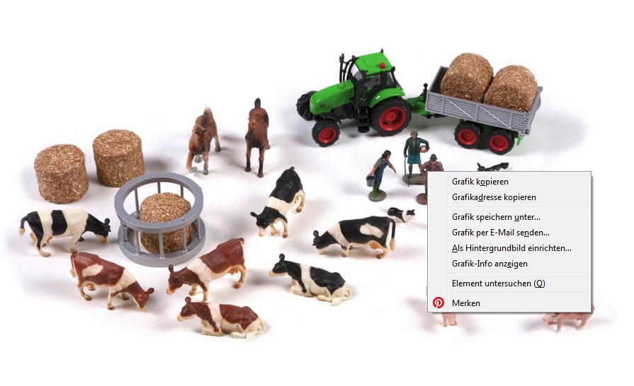 Schönes, realistisch gearbeitetes Set mit Kühen, Schweinen, Pferden, Landarbeitern, Traktor mit Anhänger und Heuballen. Material zur Sprachentwicklung und -erziehung.