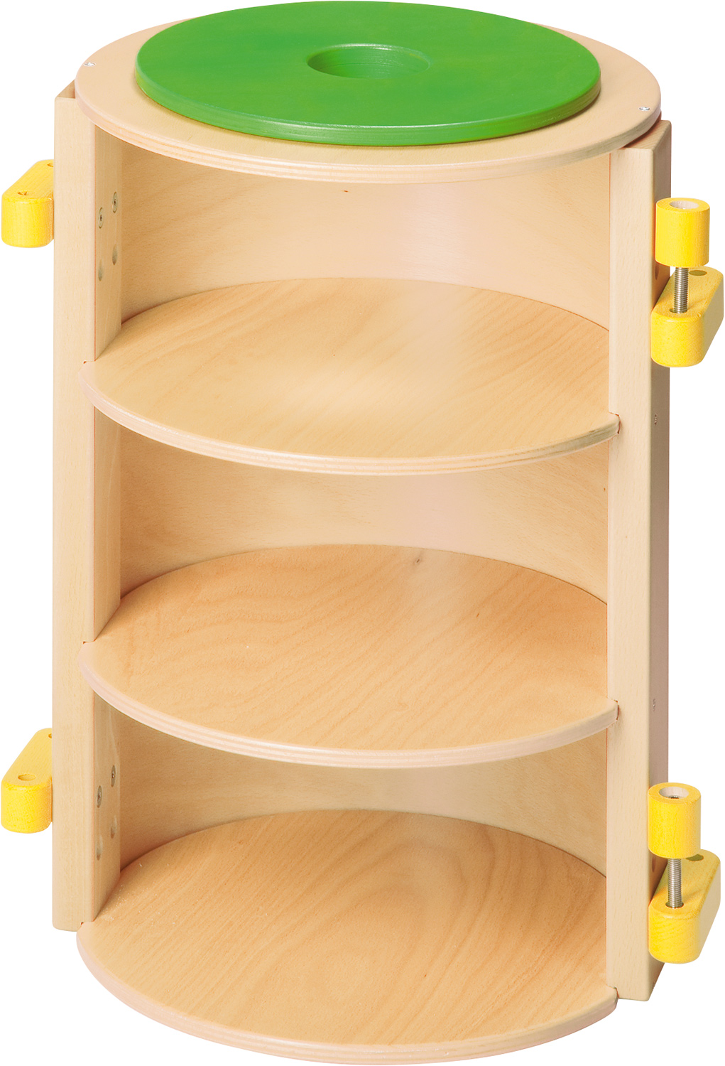 Praktisches kleines Regal mit abnehmbarem Deckel. Was im großen Loch - oder im kleinen Griffloch - verschwindet, findet sich im Körbchen wieder. Eine elementare Erfahrung für Krippenkinder. Auch freistehend verwendbar.