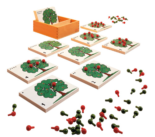 Fülle die Bäume mit der Menge roter und grüner Äpfel (Steckknöpfe aus Kunststoff), die durch ein Zahlensymbol und die Punkte am Apfelbaum gekennzeichnet sind. Das Spiel entwickelt die Beziehung zwischen Mengen und Zahlensymbolen von 1 bis 10. Dazu fördert es die Feinmotorik.