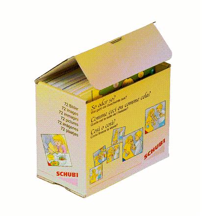 12 farbige Geschichten mit je 5–7 Bildern, insgesamt 72 Karten, Format 9 x 9 cm. Mit Anleitung.