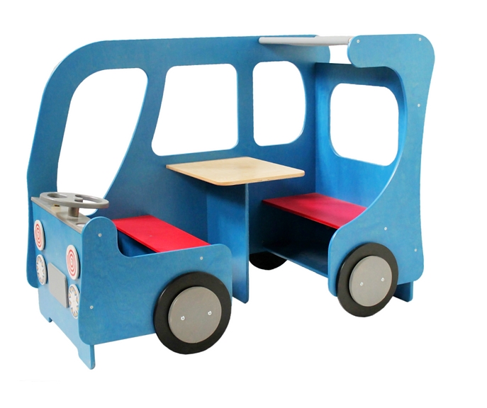 Die Spielstation lädt Kinder zum Rollenspiel ein. Zum Beispiel als "Familie" in den urlaub fahren oder als Busfahrer eines Schulbusses die Kinder in die Schule bringen. Das Gepäck kann in der hinteren Sitzbank verstaut werden. Wenn die Fahrt zu lang wird, bietet der kleine Tisch die Möglichkeit zum Malen oder Picknick machen an.