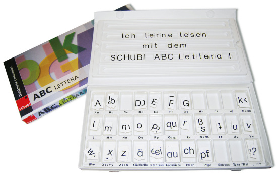 Für viele Generationen ist der Lesekasten zum Symbol des Lesenlernens geworden, gleichgültig mit welcher Methode unterrichtet wird. Die Groß- und Kleinbuchstaben sowie Satzzeichen sind nach Häufigkeit geordnet. Dank der individuellen Breite der Buchstabenkärtchen ergibt sich ein harmonisches Schriftbild. Angefangene Arbeiten können in der herausnehmbaren Setztafel aufbewahrt werden.