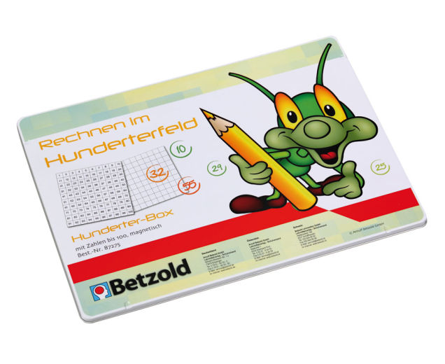 • Metallbox, Innenseiten abriebfest mit einem Hunderterfeld und einer Hundertertafel bedruckt. • 100 Zahlenplättchen, beidseitig bedruckt mit den Zahlen von 1 - 100. • Abdeckplatte aus Stahlkarton • 20 Wendeplättchen rot/blau • 20 Wenderinge rot/blau Maße (Kasten geschlossen): 31,4 x 22,5 cm