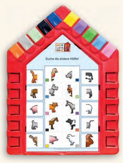 - Kontrollgerät Lernhaus, 28,5 x 21,5 cm - 24 Aufgabenkarten im Kartenfach des Lernhauses (Rückseite) - 10 Farbsteine im Dach des Lernhauses
