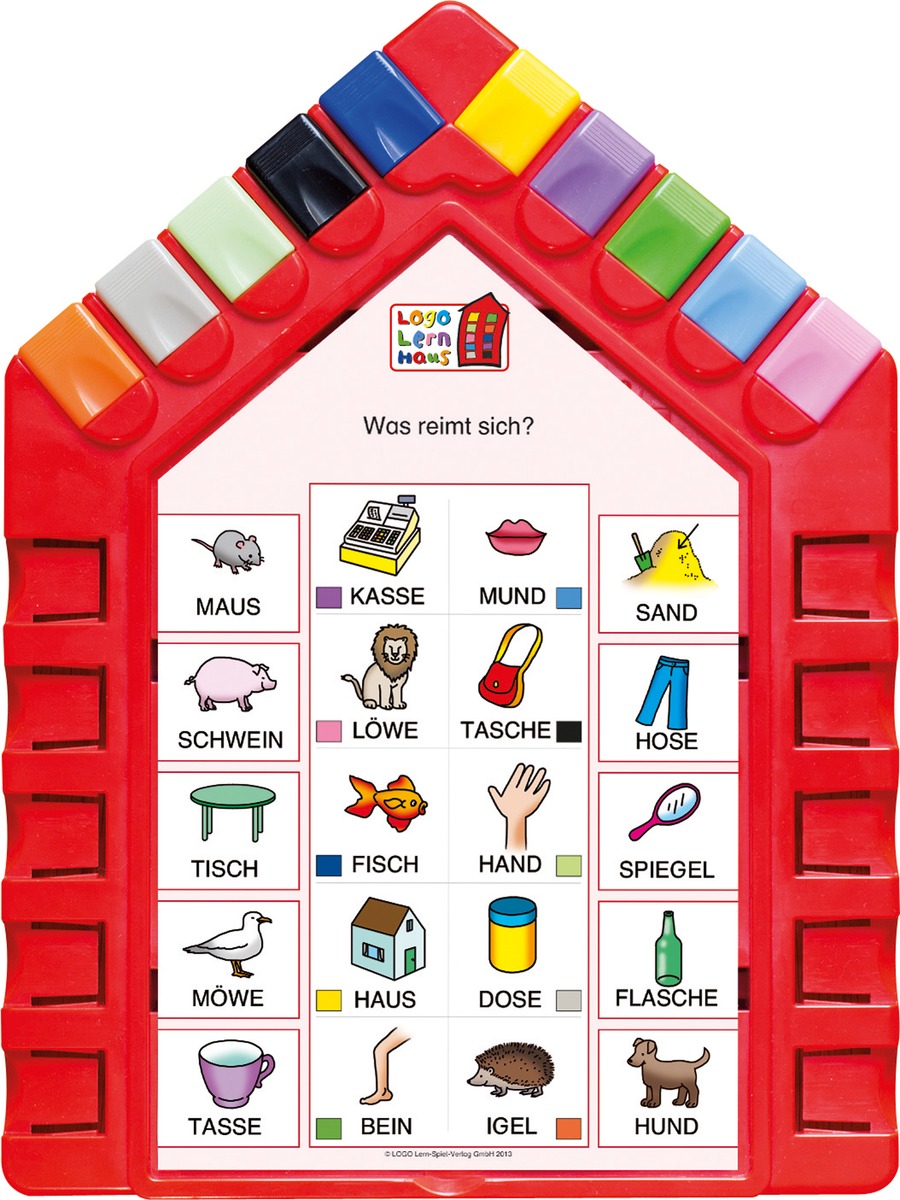 - Kontrollgerät (Lernhaus), - 24 Aufgabenkarten im Kartenfach des Lernhauses, - 10 Farbsteine im Dach des Lernhauses