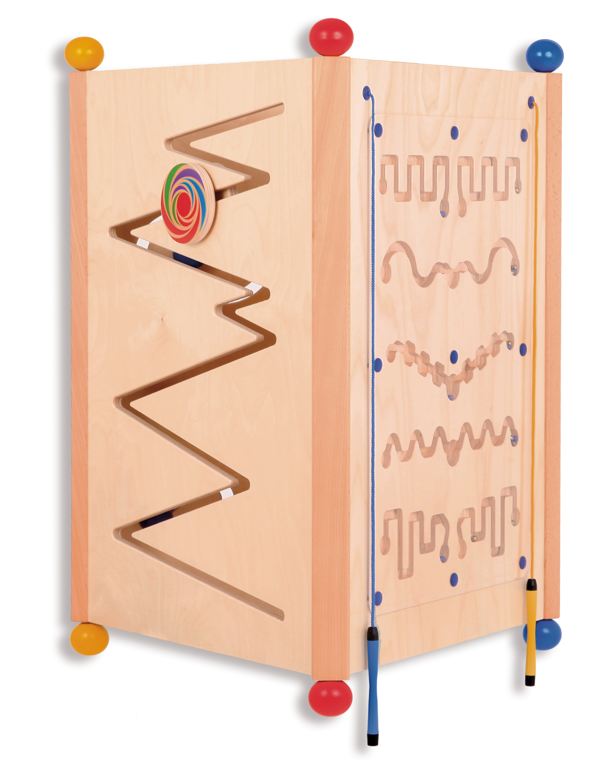 3 Elemente aus Birkenschichtholz, jeweils 82 cm hoch und 60 cm breit, mit Massivholzleisten zu einem Dreieck verbunden, Towerdurchmesser ca. 50 cm. Große Holzkugeln als Füße garantieren einen stabilen Stand und ein leichtes Verschieben oder Drehen. Jedes Spielelement ist ein geschlossenes System