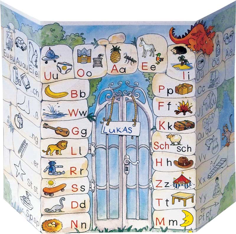 Mit Hilfe der Buchstabentabelle schreiben Kinder schon nach kurzer Zeit eigene Wörter und Sätze. Dabei arbeitet jedes Kind auf seinem Niveau. In der Anfangsphase können die beiden äußeren Teile weggeklappt werden, so dass nur diejenigen Laute erscheinen, die am häufigsten gebraucht werden. Die Laute in den Seitenflügeln können nach und nach bearbeitet und von den Kindern farbig gestaltet werden.
