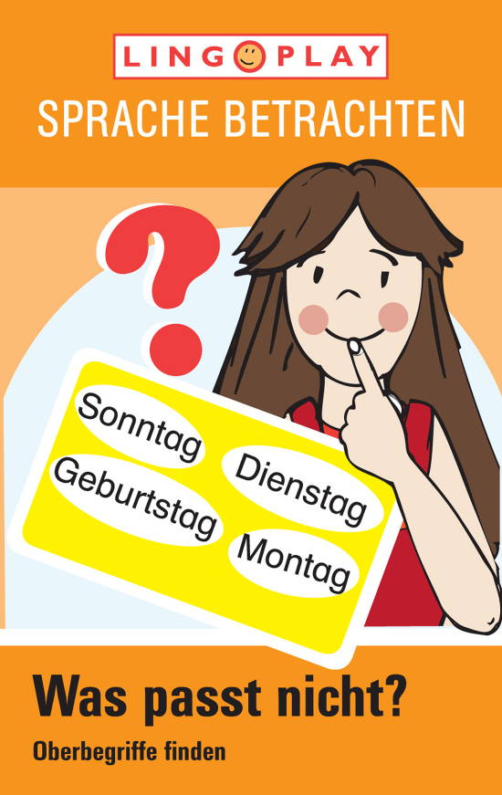 So wird gespielt: Ziel des Spiels ist es herauszufinden, welches Wort nicht zur Gruppe gehört. Der Spieler, der am Zug ist, liest die Wortreihe laut vor, z. B. Banane, Apfel, Salat und Birne. Alle anderen müssen nun raten, welches Wort nicht passt. In unserem Beispiel passt das Wort Salat nicht, weil der Salat nicht unter den Oberbegriff Obst gehört. Wer als Erster das nicht passende Wort nennt, gewinnt die Karte. Über 100 kniffelige Wortreihen und mit Selbstkontrolle!