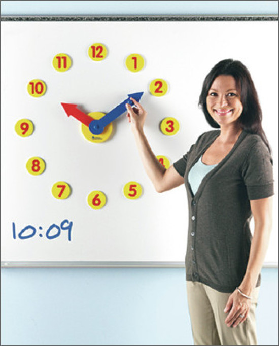 Lernuhr mit magnetischem Zeigerwerk (Minutenzeiger ca. 33 cm lang, 12 Magnetzahlen Ø 7,5 cm). Uhrzeiten an der Tafel zeigen!