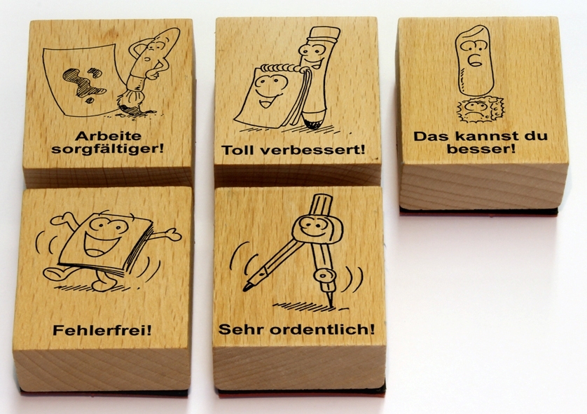 Ob Lob für fehlerfreies oder ordentliches Arbeiten oder Kritik an wenig sorgfältiger Arbeit ? die Holzstempel sind alle mit einem kindgerechten Motiv versehen, welches zum Wortlaut des Stempels passt.