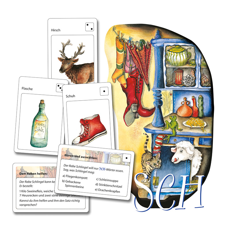 In der Hexenküche wird ein neuer Zaubertrank zubereitet. Alle Mitspieler müssen der Hexe beim Finden der passenden Zutaten und der richtigen Hexenreime helfen. Dabei geht es immer um bestimmte Laute, die in den großen Topf müssen. Verschiedene Kartensätze und Puzzle-Regale zu den Lauten erlauben eine Förderung nach Ziellaut, Lautposition und Schwierigkeitsgrad. Mit den lustigen Grafiken und Hexereien macht sogar das Üben von Problemlauten unheimlich Spaß.