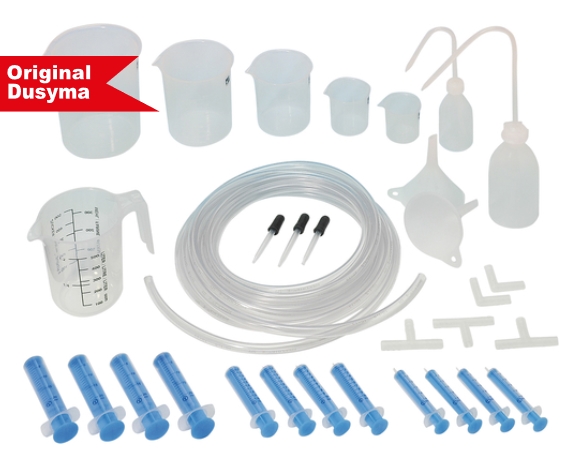 5 Meter transparenter flexibler Schlauch, 3 T-Schlauchverbinder, 2 L-Schlauchverbinder, je 4 Spritzen mit 5 ml, 10 ml, 20 ml, 1 Spritzflasche 100 ml, 1 Spritzflasche 250 ml, 2 Trichter, 1 Messbecher (500 ml) mit Henkel, 5 Messbecher mit spitzer Tülle von 50 ml bis 1000 ml, 3 Kunststoff-Pipetten, 1 Anleitungsheft mit Vorschlägen zu Experimenten.