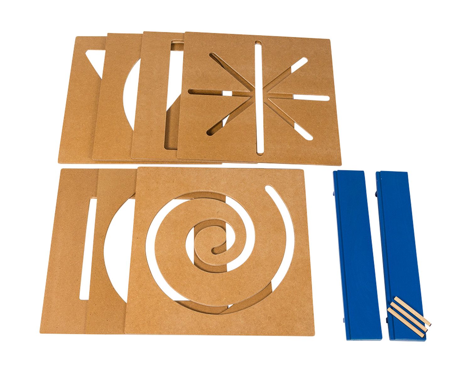 2 Einlegeleisten aus Buchenholz, 3 Sandwannenstifte aus Holz und Moosgummi, 7 Formenschablonen aus lackierter Hartfaserplatte (Kreis, Quadrat, Dreieck, Oval, Rechteck, Schnecke und Stern), Spielanleitung.