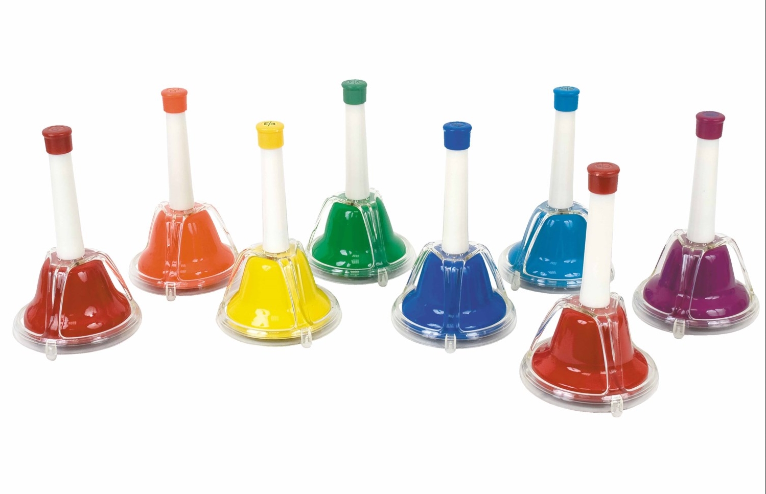 Jede dieser metallenen ­Handglocken ist mit dem Namen der Note markiert. Die Glocken sind angenehm und einfach zu greifen und das Set beinhaltet 8 diatonische Noten von C zu C.