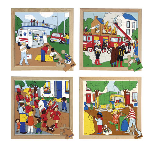 Ein Satz mit 4 Puzzles mit steigendem Schwierigkeitsgrad: die Puzzleteile werden immer kleiner und zahlreicher. Die Szenen zeigen bekannte Situationen, die auch als Ausgangspunkt für Gespräche für Themen wie zum Beispiel „Sicherheit“ benutzt werden können. Einzeln oder als Komplettsatz mit 4 erhältlich.